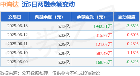 本站消息泓利财富,6月13日,中海达(300177)融资买入3313.61万元,融资偿还5256.2万元,融资净卖出1942.59万元,融资余额5.12亿元,近20个交易日中有13个交易日出现融资净买入。